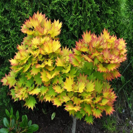 Autumn Moon Japanese Maple (Acer shirasawanum 'Autumn Moon') is a stunning ornamental tree known for its uniquely colored foliage and compact, graceful form. The leaves of this Japanese maple emerge in spring with a striking blend of yellow, orange, and red, creating a vibrant display that continues to shift in hue throughout the growing season. In summer, the foliage takes on a golden tone with hints of orange and pink, while in fall, the colors intensify to brilliant shades of red and orange. This small deciduous tree, reaching 10 to 12 feet tall and wide, is perfect for adding a burst of color to garden beds, patios or as a focal point in a small landscape.