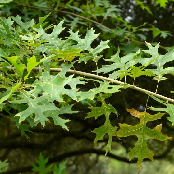 The Pin Oak Tree (Quercus palustris) is one of the fastest-growing oak species, averaging 12-15 feet in 5-7 years. Pin Oaks are typically used as shade trees for home landscapes, urban parks, and golf courses. They tolerate wet soils, giving them their common name of Swamp Spanish Oak. Due to the amount of acorns produced each year, they also have a high wildlife value.