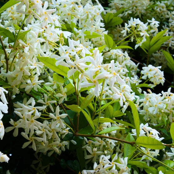 Star Jasmine (Trachelospermum jasminoides) is a fast-growing, evergreen vine prized for its highly fragrant white flowers and glossy green foliage. Blooming abundantly in late spring and early summer, this twining vine produces clusters of star-shaped blossoms that fill the garden with a sweet, intoxicating scent. Its lush, dense growth makes it an ideal choice for covering trellises, fences, pergolas, and arbors, offering both beauty and privacy in the landscape.