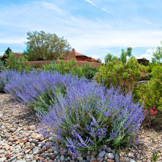 • vibrant purple russian sage plants growing in dry rocky landscape