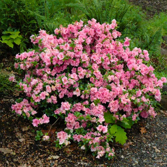 Gumpo Pink Azaleas are covered in stunning clusters of rose-pink-colored flowers with a dark pink blotch at the ends of the flower petals from mid to late spring. Gumpo Pink Azaleas are a dwarf evergreen shrub that displays extremely showy blossoms in the spring. The Lush foliage covers the dense twiggy branches, creating a fully rounded-shaped shrub.