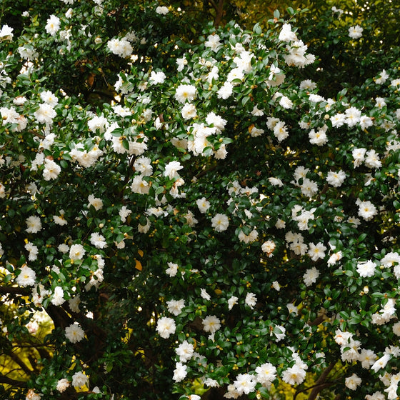 Even outside bloom season, Setsugekka pulls its weight as a broadleaf evergreen with dense branching and lustrous dark green leaves. That year-round structure is what makes sasanqua camellias such powerful landscape plants: they anchor foundation beds, add depth to mixed borders, and create a refined backdrop for perennials and seasonal color. When other shrubs go bare, Setsugekka keeps the landscape looking intentional.